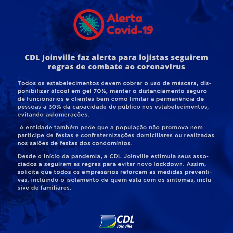 Desde o início da pandemia, a CDL Joinville estimula seus associados a seguirem as regras para evitar novo lockdown. Assim, solicita que todos os empresários reforcem as medidas preventivas, incluindo o isolamento de quem está com os sintomas, inclusive de familiares.